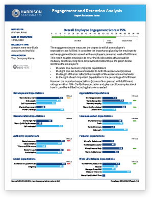 Track employee engagement levels over time to determine improvement for individual employees, teams, or the entire organization. The Harrison Employee Engagement Pulse Check can be completed in less than 5 minutes and provides an excellent means to achieve continuous improvement as well as maximize management's engagement ability.