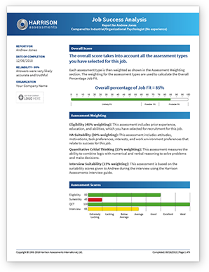 Harrison Assessment's Job Success Formulas are developed from 30 years of world-wide job performance research and provide a comprehensive integrated hiring system. The final employment assessment score measures candidates' eligibility, suitability, and interview scores against the ideal candidate for the position in your organization.