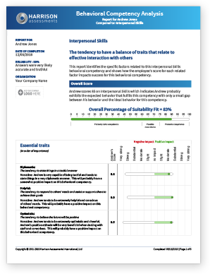 If your organization already has their own behavioral competencies, our 175 Harrison traits can easily be incorporated into custom formulas that measure your employees against your competencies. Our Behavioral Competency Reports compare an individual with the detailed success behaviors needed to become competent. You can empower your employees with development reports that target specific development areas needed to achieve a competency.